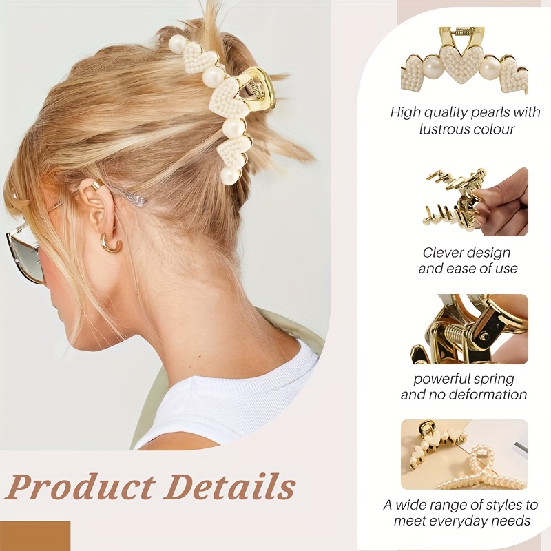 设计精致:融合珍珠与金属元素,一款是心形珍珠点缀的金色抓夹,一款是全珍珠编织抓夹,风格分别偏向华丽与简约,满足不同穿搭场景的造型需求。 材质优质:珍珠光泽柔和且质感细腻,金属部分做工精细,镀层均匀,既保证了美观度,又提升了耐用性。 风格百搭:珍珠元素自带优雅属性,可适配法式复古风、名媛风、日常通勤风等多种穿搭风格,为发型增添精致感,轻松提升整体造型的高级度。 实用性强:抓夹的夹力适中,能牢固固定中长发,无论是半扎发、盘发还是打造慵懒的随性发型,都能轻松驾驭,是提升造型精致感的实用配饰。